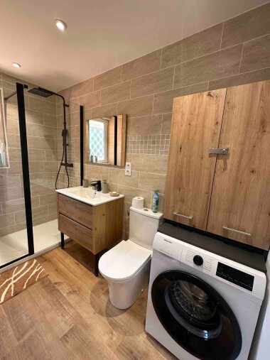 Essentiels pour la lessive : Lave-linge, fer à repasser, planche à repasser et lessive sont fournis.